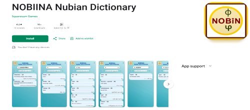 قاموس نوبينا النوبي - قاموس رائع مُكمّل لدروس "نوبيين" المذكورة أعلاه، مُصمّم للهواتف المحمولة، لتعلم كلمات لغة نوبين النوبية وقواعدها الأساسية، للناطقين بالإنجليزية والعربية، مع صوت. من إعداد الدكتور حسن نور وفريقه المُتفاني في موقع نوبين دوري كولود - مُتاح على جوجل بلاي. يتضمن القاموس الأبجدية النوبية، وقواعدها الأساسية مع أمثلة جمل، وميزة البحث، وقاموسًا عشوائيًا.